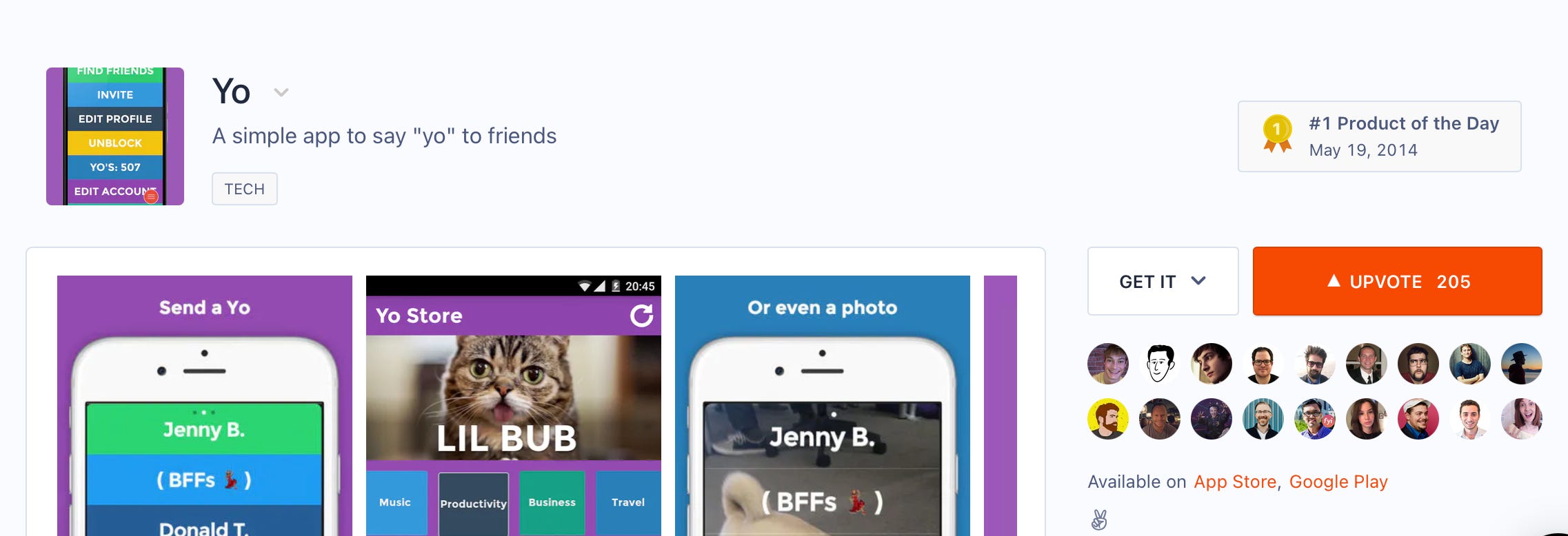 producthunt founder + investor @ryanhoover even slid into the mix likely with the memory + familiar feeling of joy from changing the world w/ single words when he gm’s predecessor. it also turned out the internet historians were right that we’d in fact observed this phenomenon years before. in 2014 yo was ph’s first ever launch + took the world by storm