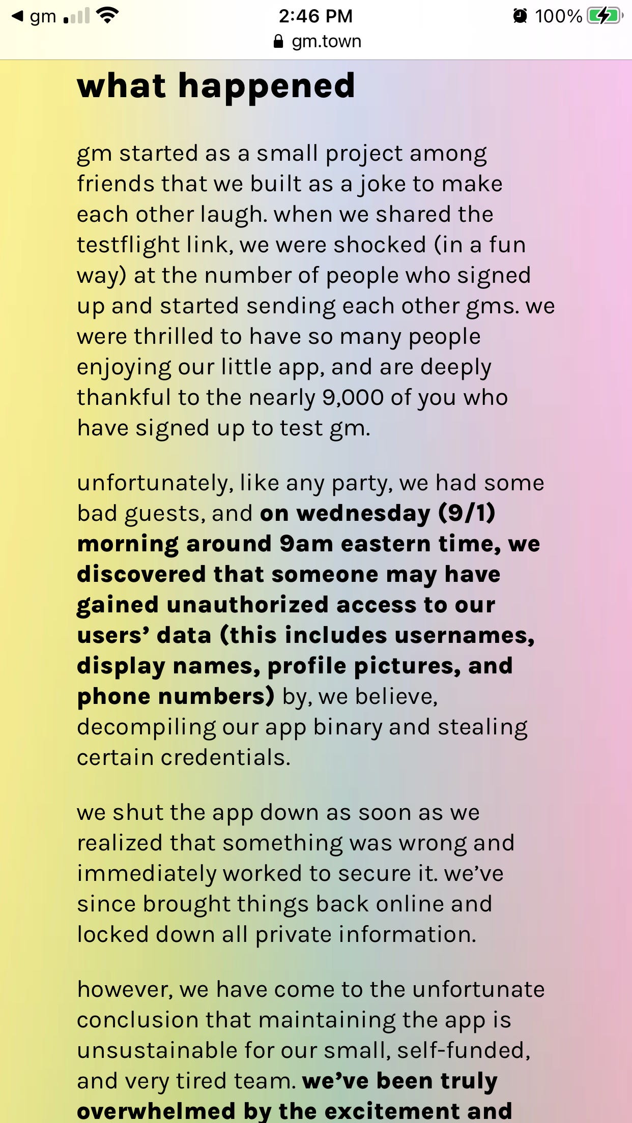 almost as quickly as it began, gmtheapp started showing cracks… by late wednesday gm users noticed they were blocked from gm’ing their homies. and the next morning, profiles were locked
