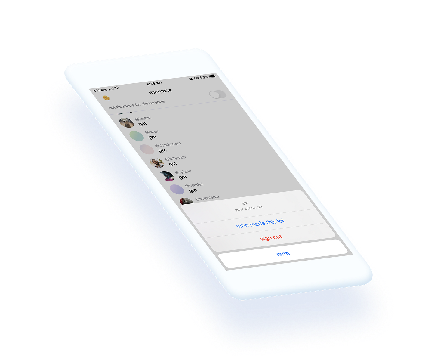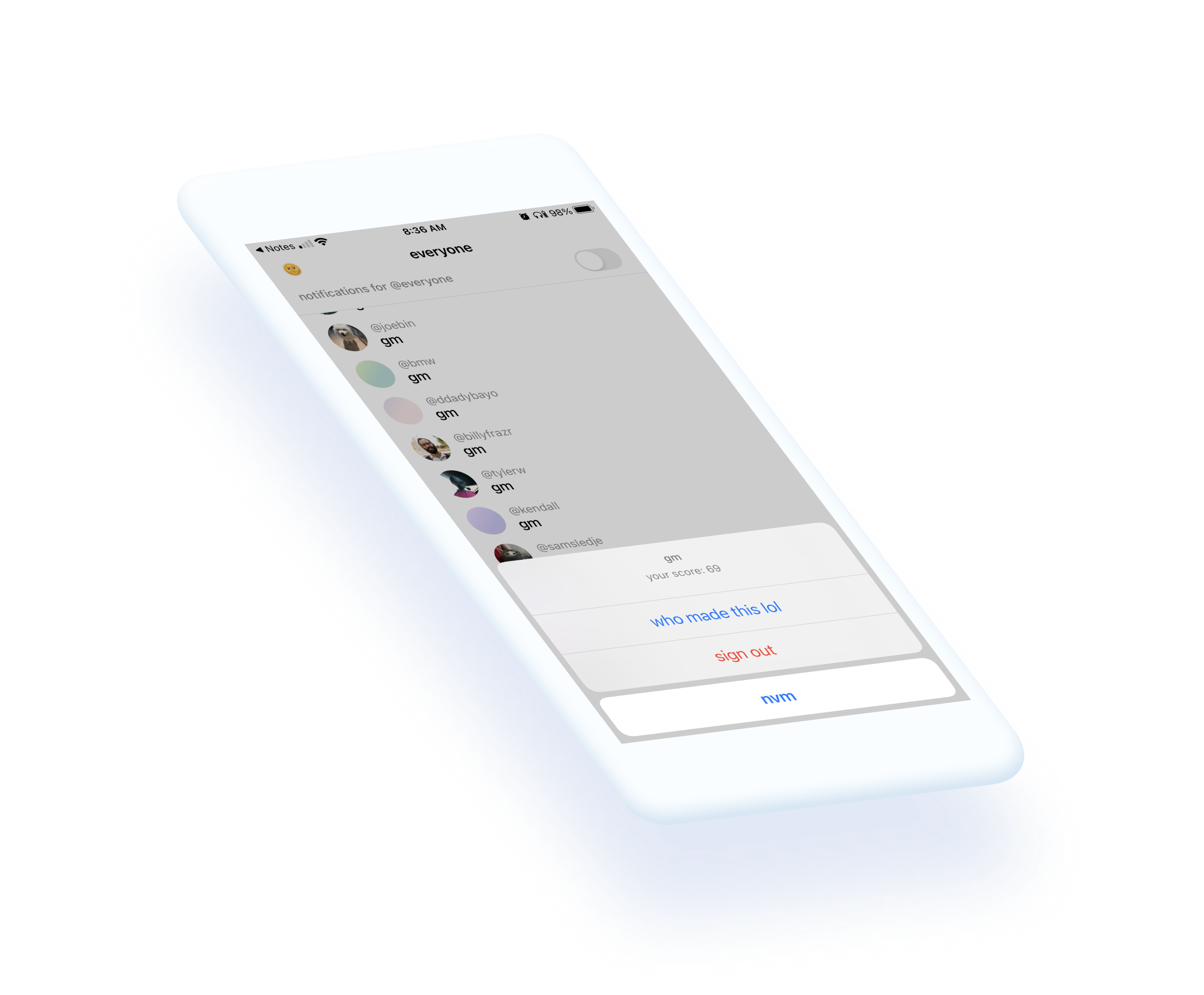 so after crushing my notifications w/ gm’s, i spent a few hrs searching for more on gm… that really didn’t get me anywhere on who the chargers were behind gm other than finding that @viktoriia was somehow involved with @bhwags in the drop. turns out there was still a decent amount of confusion about who was handling this traffic + yeeting gms to everyone. but w/ the virality + user generated shitposting (an elusive form of ugc) it seemed that the 8 person team @gm were onto something magical. by wednesday more vcs were sliding thru, @gabygoldberg was a stan… @zacklukoff crossed over to the consumer darkside… @nivdror added his wife into the tf