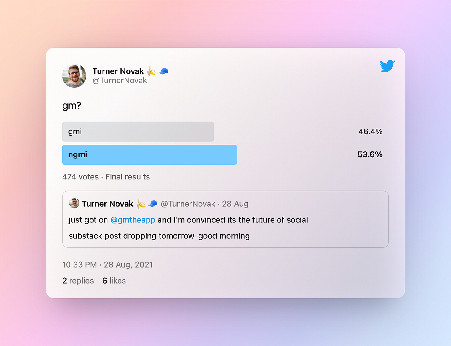 the oracle of vc shitposts @turnernovak slid into the testflight on sunday + fanned the hype by yeeting a poll taken by almost 500 people on gm’s fate: gmi 46% | ngmi 54%